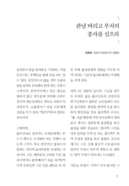 관념 버리고 부처의 종자를 심으라 페이지 정보 작성자 가람지기 작성일14-06-01 14:30 조회5,862회 댓글0건 본문 관념 버리고 부처의 종자를 심으라 김윤희 ㅣ 맑은소리맑은나라 발행인 댓글목록 등록된 댓글이 없습니다. 이전글 다음글 목록