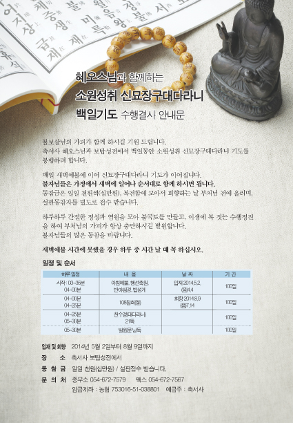 신묘장구대다라니 백일기도 페이지 정보 작성자 가람지기 작성일14-06-01 12:12 조회5,185회 댓글0건 본문 신묘장구대다라니 백일기도 댓글목록 등록된 댓글이 없습니다. 이전글 다음글 목록