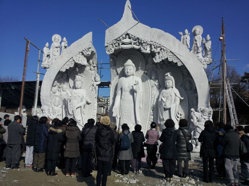 작업이 거의 완성되어가는 삼존불 현장에 어제 큰스님은 삼존불사에 뜻을 함께 하시는 신도님 80여분과함께 친견을 다녀오셨습니다.