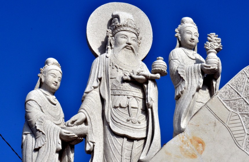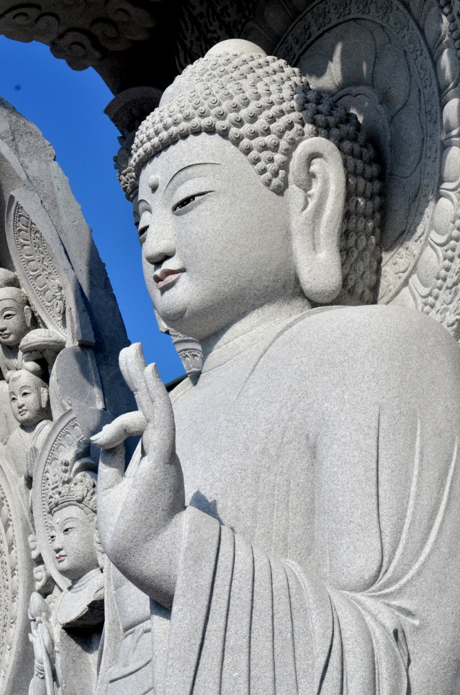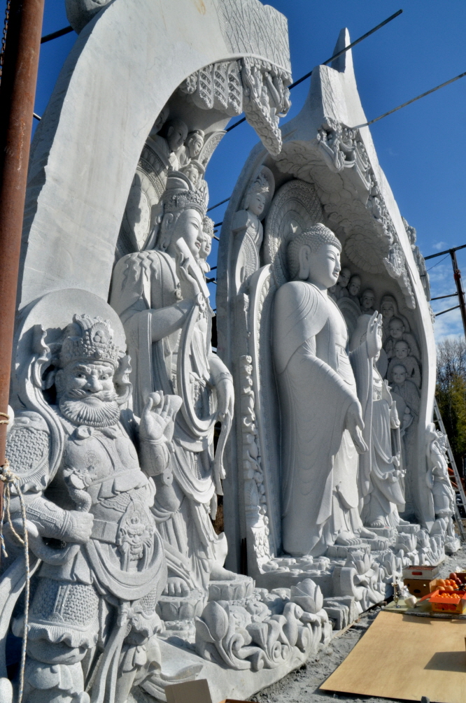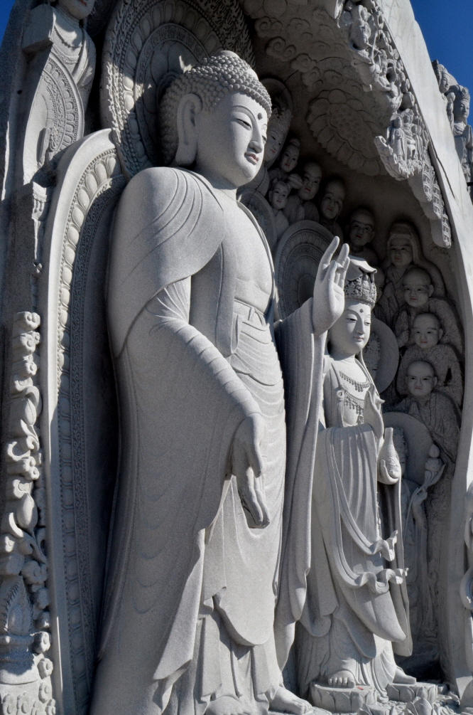 삼존불은 아미타 부처님이 권속들과 함께 극락세계에서 사바세계로 내려 오시는 모습입니다.
