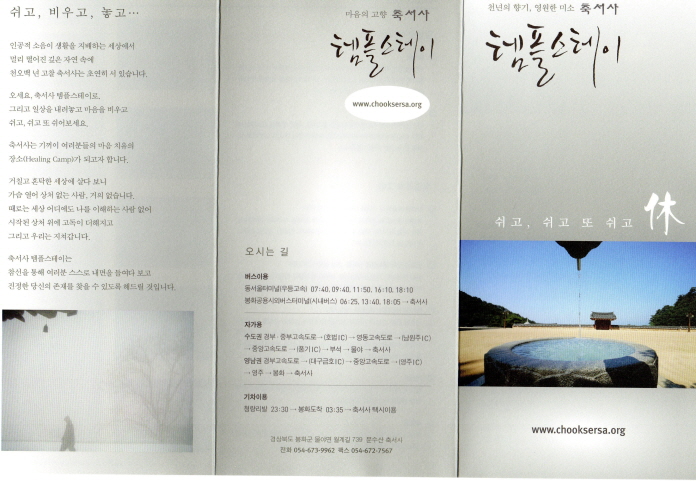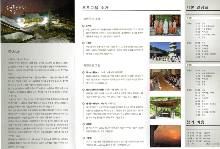 그 준비 과정 중 ‘템플스테이 안내장’ 도 만드는 것이었는데 오늘 드디어 인쇄된 안내장이 도착 하였습니다. 살펴보시고 필요하셔서 요청하시면 송부해 드리겠습니다.