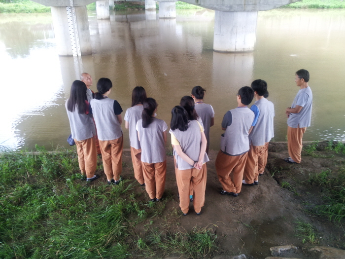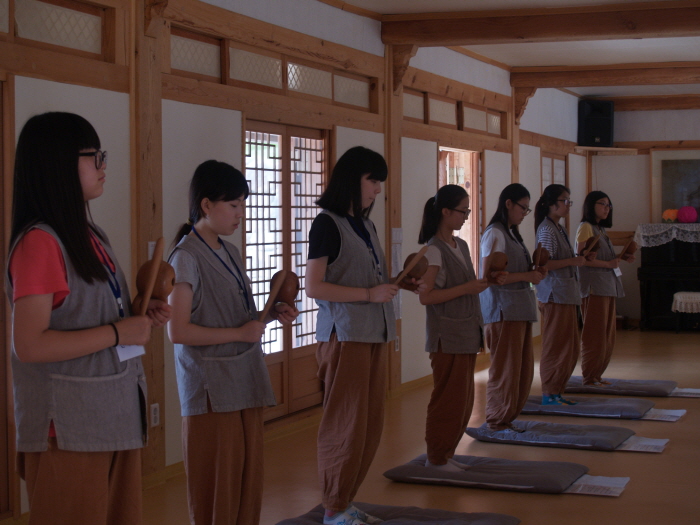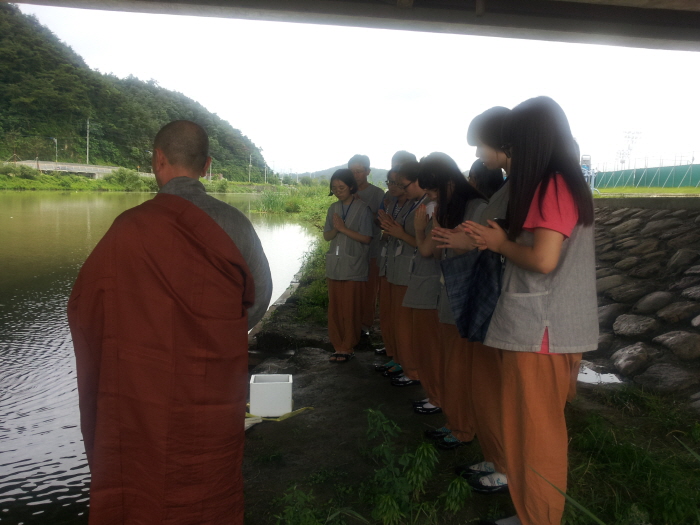 어제 시작된 수행형 템플스테이에 참가한 참가자들이 사물체험, 좋은글쓰기, 스님과 차담, 목탁실수, 방생 등 오늘 불교문화를 체험 하는 풍경 입니다.