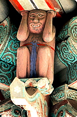 강화도 전등사 대웅보전의 예. 임진왜란 때 불타고 새로 지음. 약 400살. 원래는 고려 1700년 전에 지음. 강화도는 섬. 목수가 들어가 다시 지으려니 가족과 이별. 친구가 찾아 와 마누라 바람 나 도망갔다 알려 옴. 얼마나 괘씸했겠는가. 그래서 이 건물 4군데 추녀마루 밑 귀퉁이 발가벗은 여인이 400년 동안 지금도 벌서고 있음. 그것도 제대로 서는지 지켜봐야. 딱 지켜 봄. 어떤 귀퉁이는 두 손으로 벌서고 어떤 귀퉁이는 하도 팔 아파 한 팔 내리고.*사진 참조