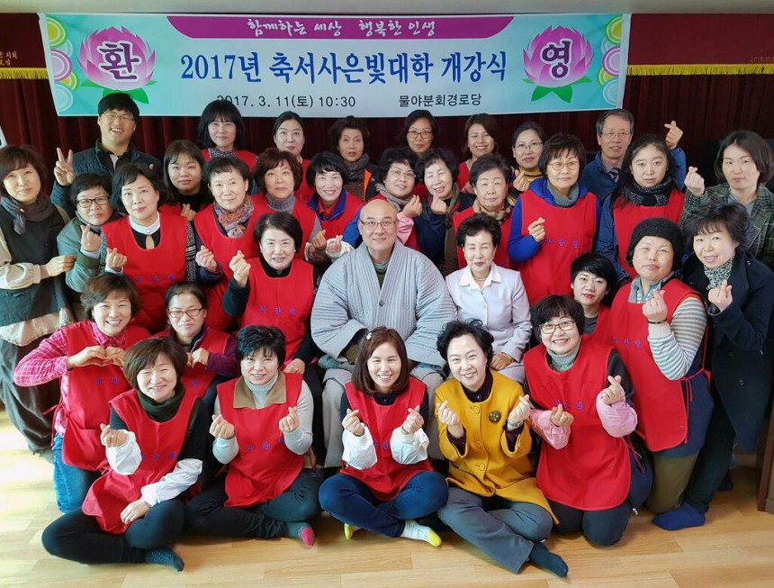 정성가득한 밥상을 입학하신어르신 80여명, 입학식을 축하하러 와 주신 무여 큰스님, 군수님을 비롯한 내빈들 입학식장 마당을 떠들석하게 축제장으로 만들어준 풍물단, 부족한 일손을 돕기위해 와주신 15기 불교대학 졸업생들 등... 160여명의 인원이 맛있게 드셨답니다.