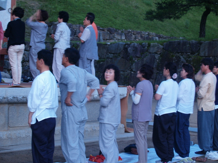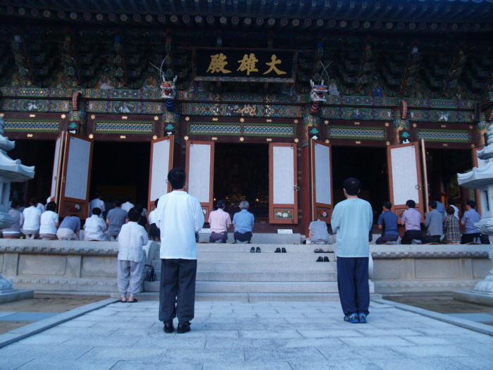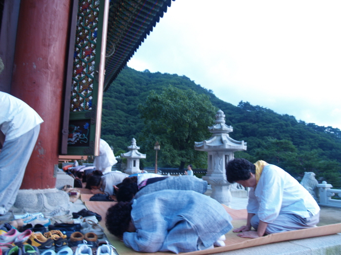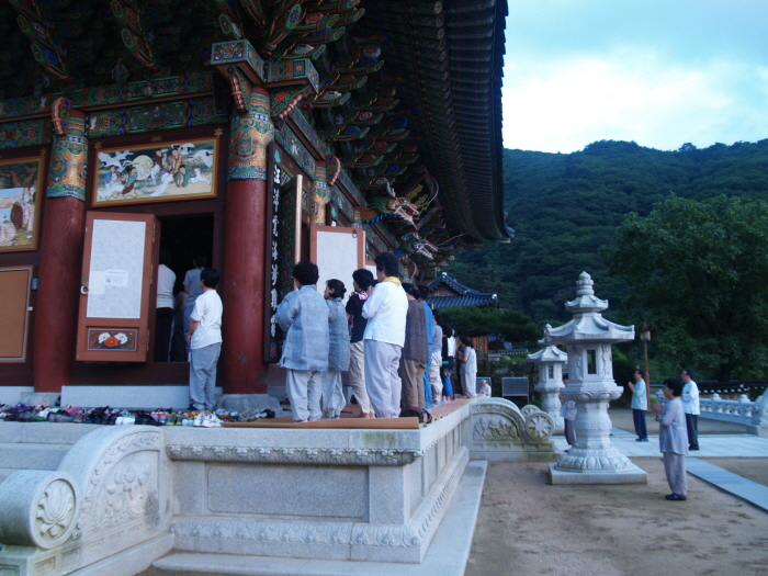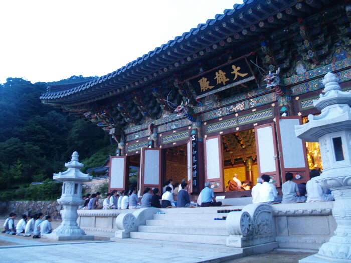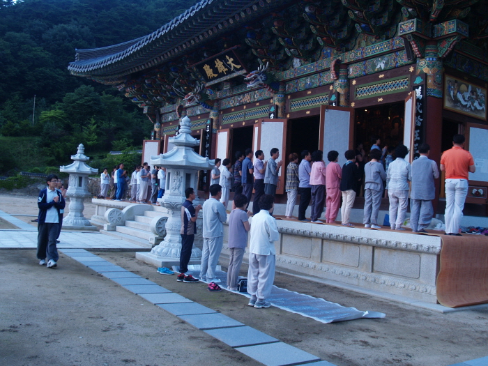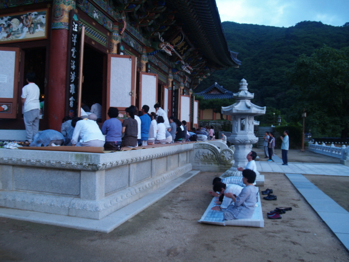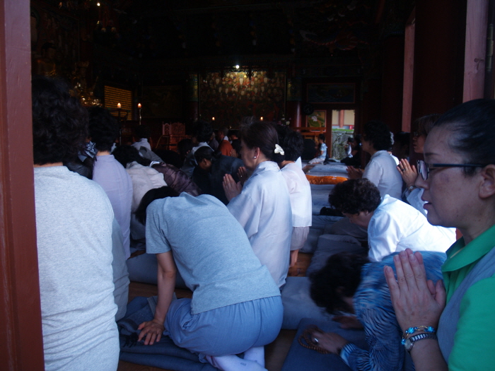 150여분의 참가자들이 대웅전 안을 채우고 넘첬습니다. 시원하게 대웅전 주변에 자리를 깔고 저녁예불을 드리고 큰스님의 주옥갘은 법문을 듣고 계시는 풍경입니다.