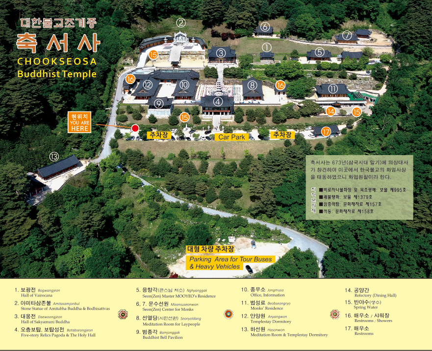 마음의 고향 [축서사] 가람배치도 1. 보광전 2. 삼존불 3. 대웅전 4. 보탑성전 4. 사리보탑 5. 응향각 6.문수선원 7.문수선원 8. 선열당 9. 범종각 10. 종무소 11. 법성료 12. 안양원 13. 하선원 14. 공양간 가람배치도